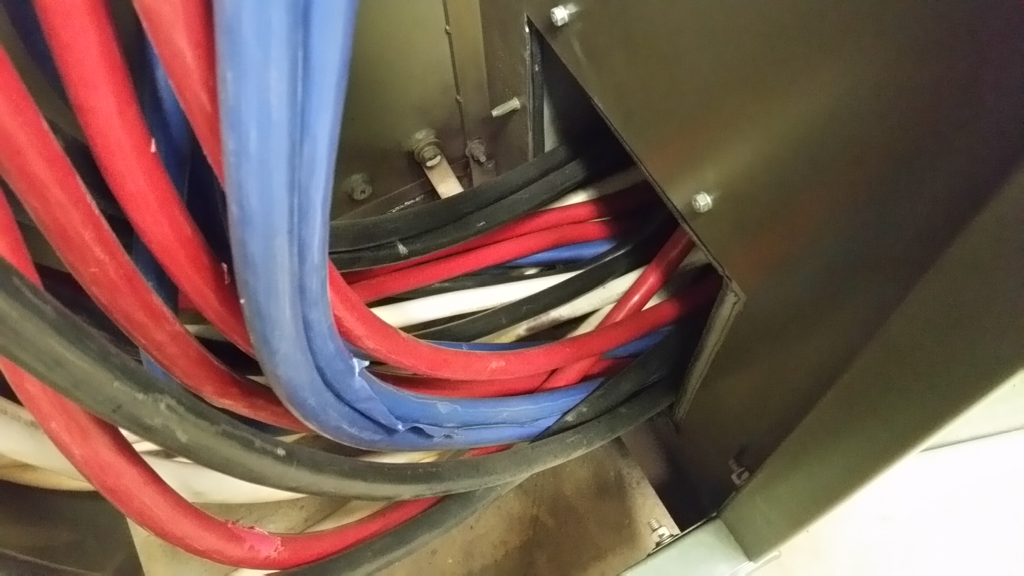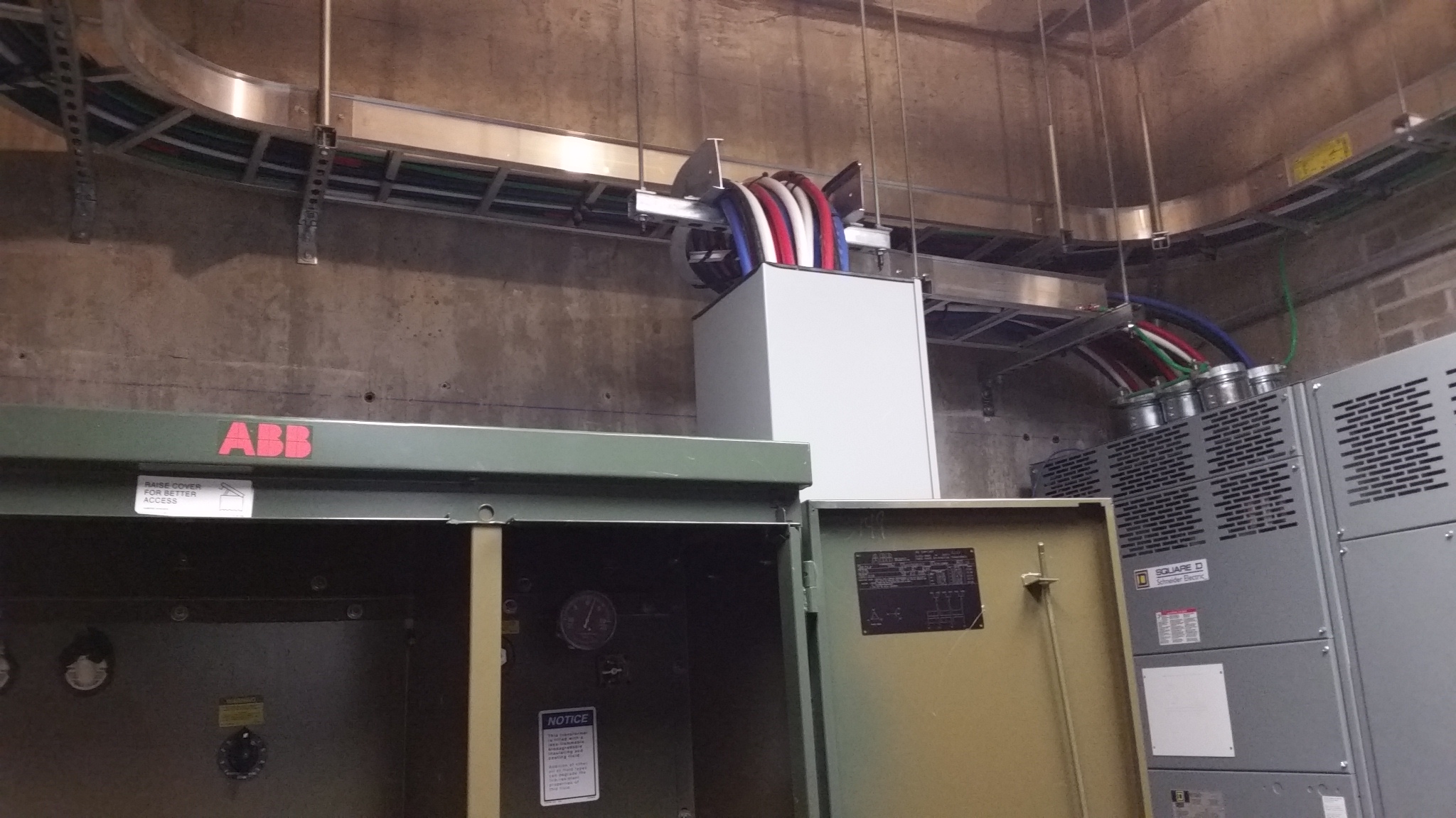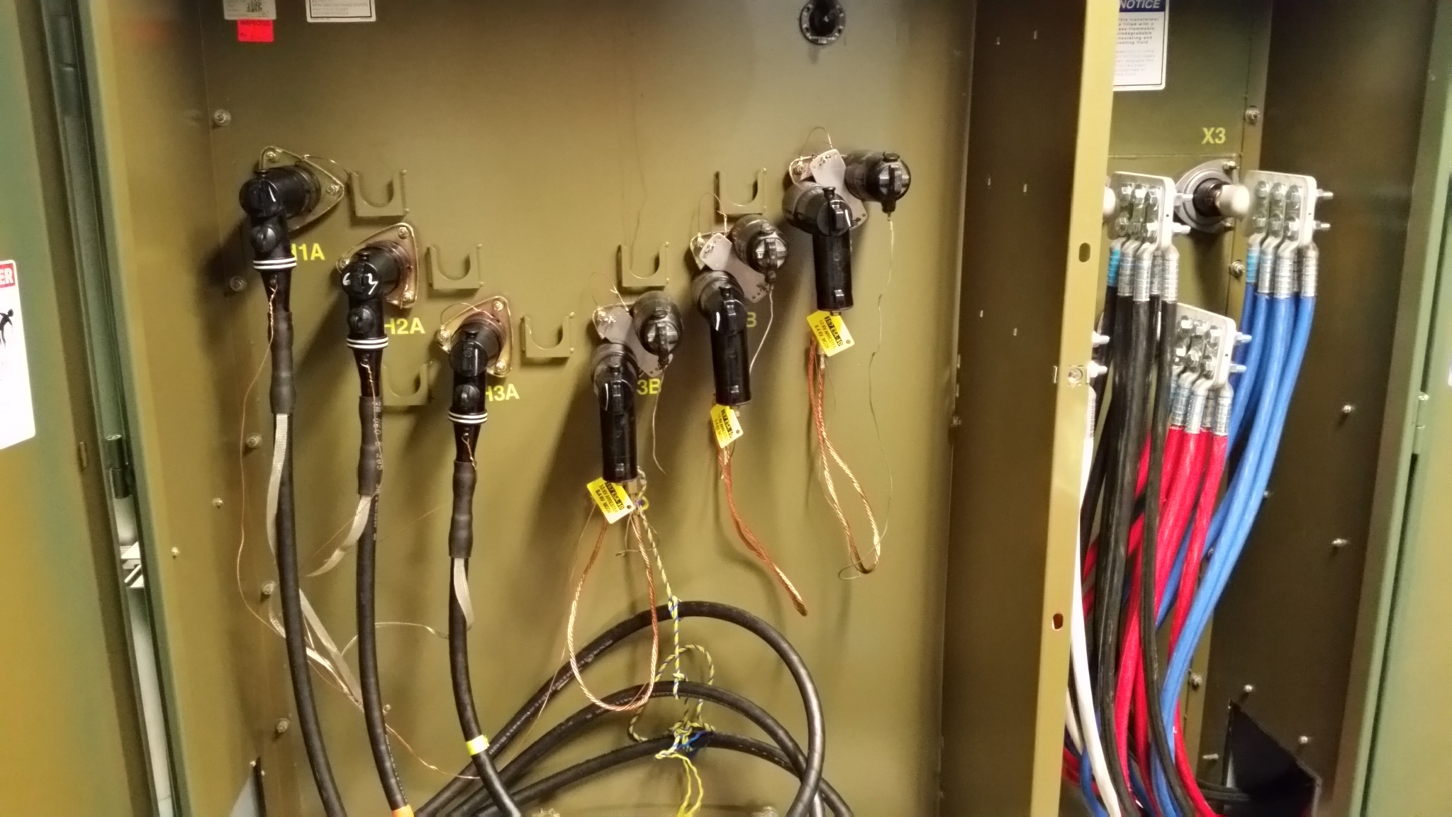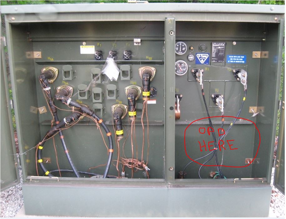 stevenal wrote: Field modification? Looks like the semi-circular hole adjoining the square one was an afterthought that left a sharp edge. That semi-circular hole was created by the fault, so yes, I guess you could consider it a field modification. Ha!. Seriously though, although this is a pad mounted transformer it is installed in an existing below grade vault. It would be very costly to bust up the slab to get conduits in from below grade so we fed it from/to overhead. The primary is in cable tray over and down through a conduit. The secondary is in wireway. This pic gives you an idea. Attachment: