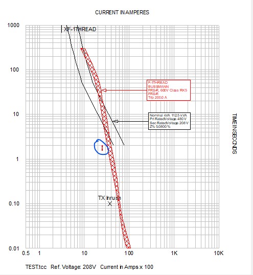 Has your model produced longer clearing times than 0.5 seconds / 30 cycles for the subscribed conditions? If not, there would not seem to be an issue. In SKM you can set a max clearing time. I assume you can do the same in ETAP and EasyPower. Thanks for the response bbaumer. Yes, I am aware that you can set max clearing time, however the issue is setting the clearing time at .50 when a fault at a particular bus will not clear that fast. I agree, I dont know how sustainable an arc will be at the low voltage, but what I do know is if a secondary bus is relying on the primary OCPD to clear the fault, it likely won't happen in .5 sec. The attached TCC shows a 112.5 KVA with the primary fuse. The 208-volt bus arcing fault current is about 2600 amps. It is obvious that a secondary fault will not clear at .5 when relying on the primary fuse to clear. If someone was to get injured and you were sued, how could justify a blanket statement of all low voltage clearing times should be set to .5? In this case with a 2 sec clearing time its at 8 cal/cm2 and at .5 its at 1.5 cal/cm2. I understood your question and application and your example TCC, but again, is that from your actual model? Do you even have any 112.5 dry types in the actual facility in question? I agree with you that I don't think "arbitrarily" capping a clearing time at 0.5 seconds is a good idea but before I made a big deal out of it with the customer I would create the actual model and evaluate the results, with and without the 0.5 second cap. If the results weren't significantly different I would ignore the instruction for the cap and if they asked, I'd tell them I didn't need to cap it as the results were close to the same. If the results were significantly different and the calc'd energy was much higher than the capped I would bring it to the customer's attention and go from there. If they insisted I would put it in my reports and recommend against it. Also, for what it's worth, I don't normally put labels on dry types that don't have doors (which are by far the majority) as they are not typically a piece of equipment that is likely to require inspection, testing, maintenance etc. while energized so I exclude those from the labeling. I would definitely be looking for an issue at the secondary side disconnect or panelboard being fed from the transformer and proceed as mentioned above. I suspect they had some consultant at some point in time tell them the IE was 103.2 calories/cm^2 at the line side of a 30 amp disconnect fed from a 15 kva transformer with 300' of #10 in between and decided enough was enough and instituted the 1/2 second cap policy. Yes this is from an actual model. When I referenced first bus, that is the downstream panel or disconnect as we do not label dry type transformers either.