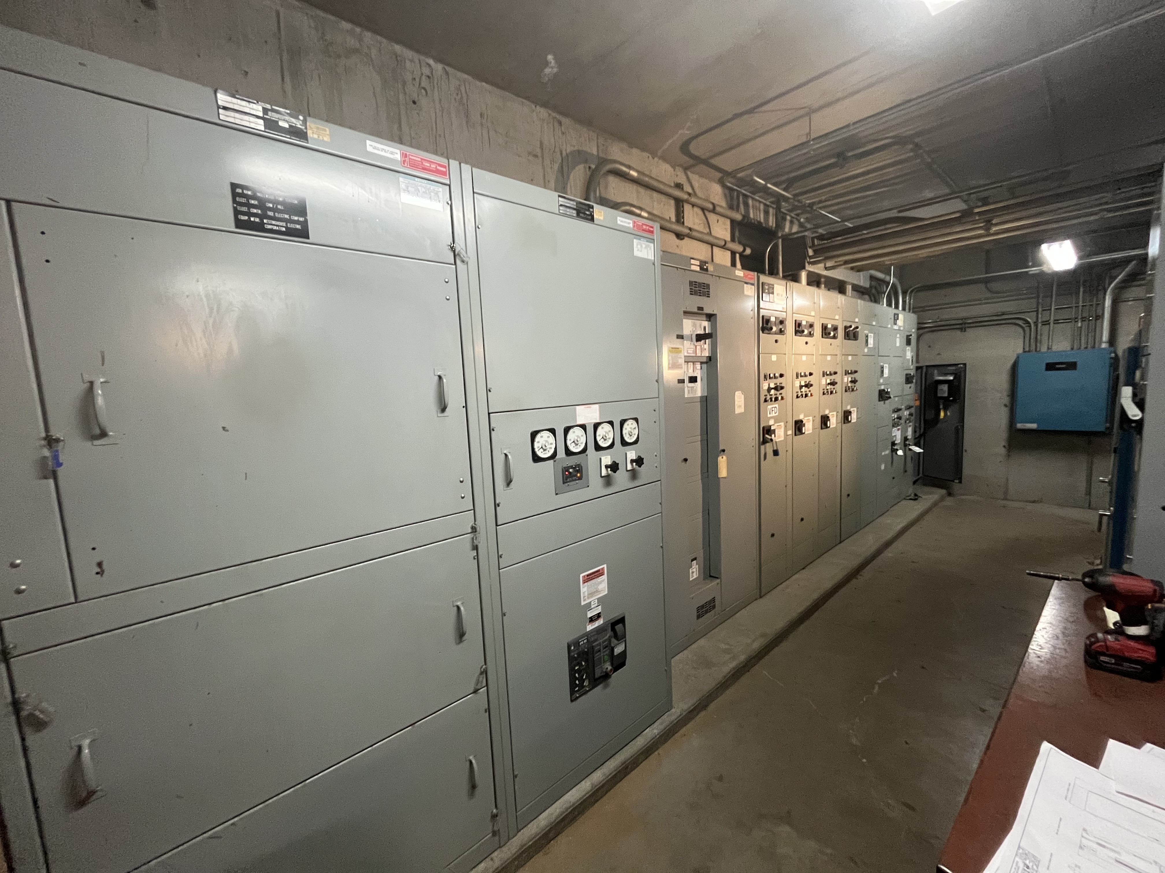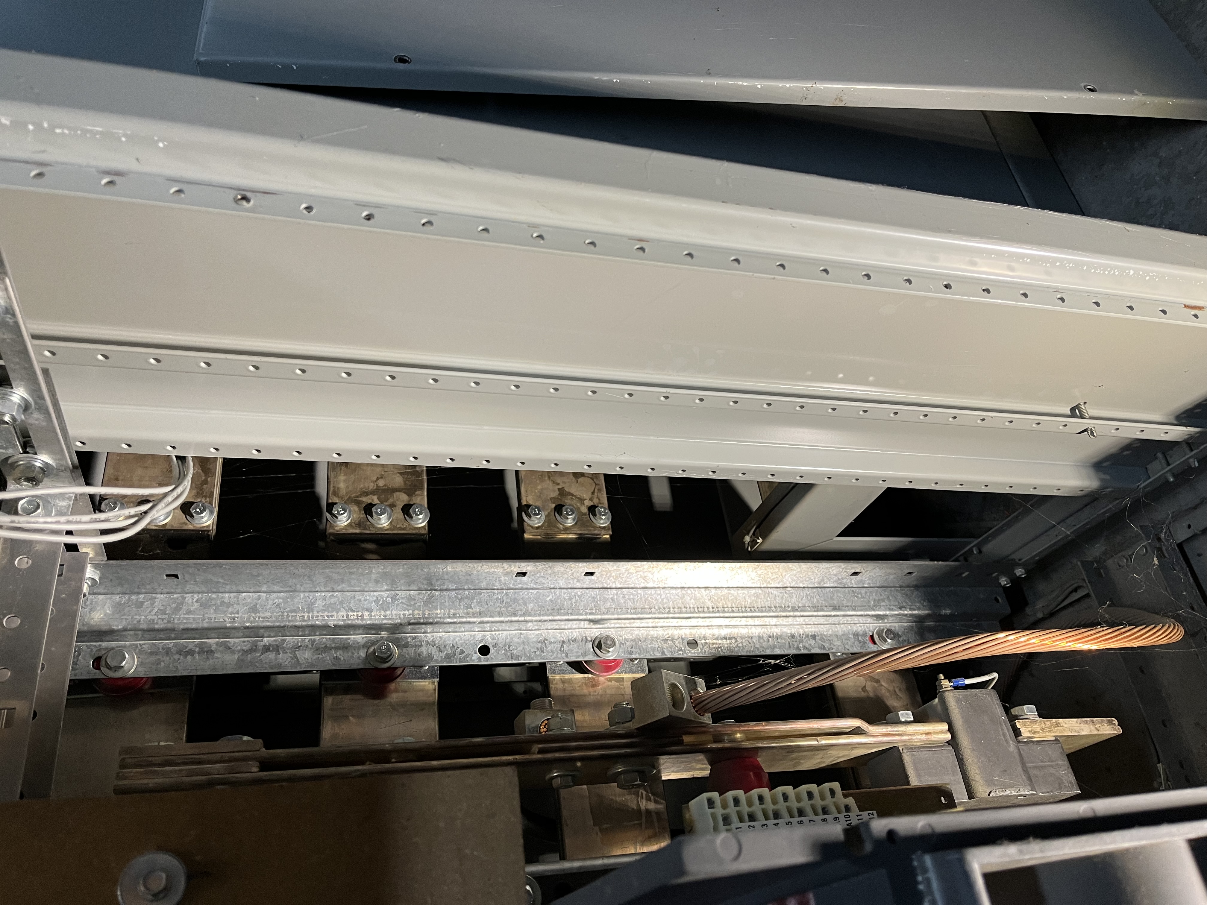 Here are two photos illustrating what I'm talking about; one is the gear which is internally open, and the other shows the busing on the load side of the breaker passing into adjacent equipment.