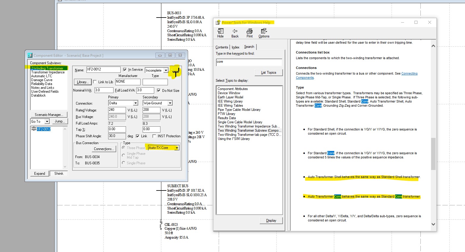 BarkFlash wrote: stevenal wrote: I'm not following your math here... 100KVA three phase 240V load. 100KVA / 240V / 1.732 *1000 = 240.56A, single phase would be even higher, 417A. stevenal wrote: VA is conserved so VA in is equal to VA out plus loss. True, VA is conserved, but it will not match the VA listed on the nameplate. See the attached picture in first comment or follow the link. It is not unusual for a BB Xfmr to supply a load 10x the nameplate rating, depending on the turns ratio. http://www.delzer.com/hubbell/acme_cat/#122/zstevenal wrote: I'm not sure how an auto is any more likely to saturate than any other. Agreed. But the fault at the secondary is not completely limited by xfmr impedance like it is in an iso-xfmr, because the secondary is wired directly to the primary. So modeling with an iso-xfmr would be incorrect. SKM Power Tools has a TYPE option in the Component Editor where you can select "Auto-TX Shell" or "Auto-TX Core" but it doesn't seem to do anything. I don't see another way of adding an Auto-Xfmr. Can ETAP or Easy Power do this? I think you're right that changing the connection type in SKM to Auto-TX Core doesn't do anything. Here's what SKM Help says on it: Attachment: