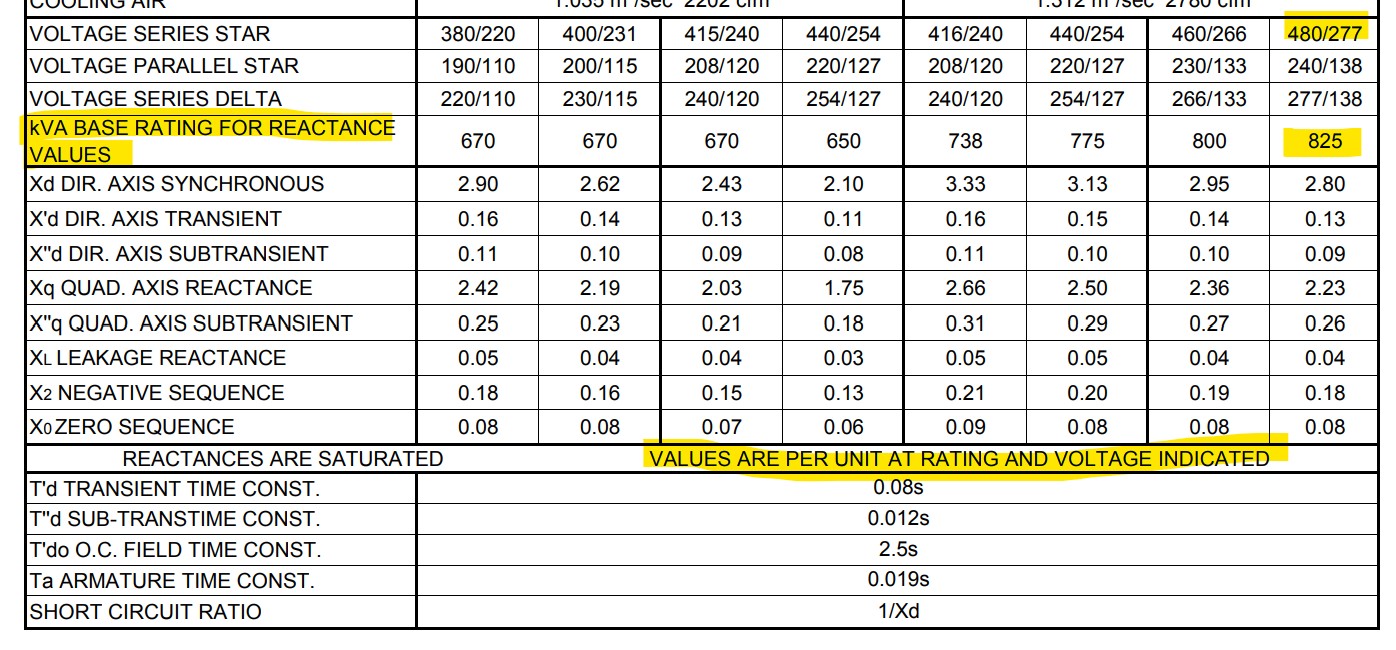 After thinking about this and looking at the data sheet for one of the generators, I think I may have answered my own question. I think you have to use the alternator rating, not the entire generator set rating. My reasoning for this is, the alternator will have a "base" KVA and the decrement curve data is often given in per unit. The alternator manufacturer doesn't necessarily know what engine the alternator will be paired with and what the final genset output rating will be. They only know what their KVA rating is at a particular voltage. Data sheets are published for the alternator. I think therefore, you must use the alternator kva rating in the SKM model for the per unit decrement curve information to be accurate. At least for fault current modeling, not for load flow. Make sense anyone? Agree / disagree? Here is the nameplate and the data sheet for a 480V, 500 kw genset. As you can see, the alternator is 660kw rated at 480V. The engine-alternator combo is only 500 kw. Attachment:
