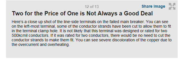 mike01 wrote: not sure if “trimming the hair” is the right approach [I believe there was an article about this in a recent EC&M an investigative article], I'll be more blunt. It is not only a Code violation but a safety violation for five reasons: 1. The ampacity is gone. If you have a cable with a certain amount of cross sectional area and you go and trim away part of the cable, guess what it isn't anymore? 2. Ever heard of "alpha spots"? At a joint contrary to popular belief only a small fraction of the available surface area in contact actually conducts electricity, known as alpha spots. At this point we need all the surface area we can get. So the contractor then takes away surface area. You can see this property in action in a variety of ways such as noticing that "cable failures" are almost never in the middle of the cable. They always start at the joints, even if it's a cable failure and not a joint failure. 3. The cable lug is designed for a specific amount of material to be present and actually crushes and essentially cold welds the materials together in order to achieve "intimate contact" and hence...alpha spots. Taking away material compromises this. Take away enough and you'll get a high resistance joint instead. Typically though this is an extreme problem. 4. What about the loose strands that remain? These will create electromagnetic fields (arcing, tracking, and other corona phenomena) which creates electrical noise as well as other problems if it is severe enough such as overheating at the joint, although this is mostly a bigger problem at medium voltage. 5. The mechanical properties are compromised. So under fault conditions the joint can fly apart. Simply put, "trimming the hair" should be tantamount to trimming the work force.
