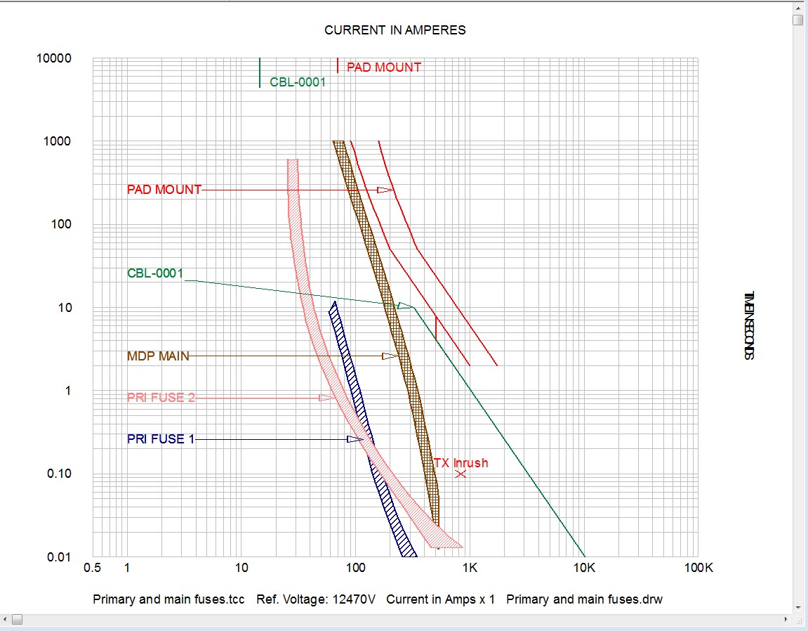 Here's an attempt at showing the curves. PRI FUSE 2 is the 104A fuse, PRI FUSE 1 is the 150A fuse. MDP main are A4BQ1200's in the MDP on the secondary side.